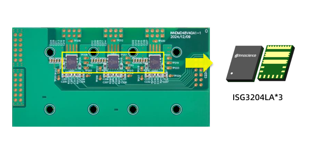 INNDMD48V22A1 (integrated solution) uses three ISG3204LA half-bridge GaN chips (with built-in drivers), offering high integration and a simpler layout.