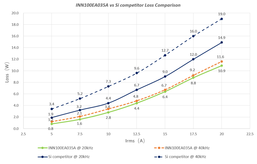 - The discrete solution (INN100EA035A) achieves total losses of 11.6W, compared to 19W for the benchmark Si solution (39% reduction)