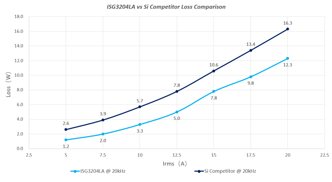 The total power loss of the package-on-package solution (ISG3204LA) is 12.3W, while the benchmark Si solution is 16.3W, a reduction of 24.5%.
